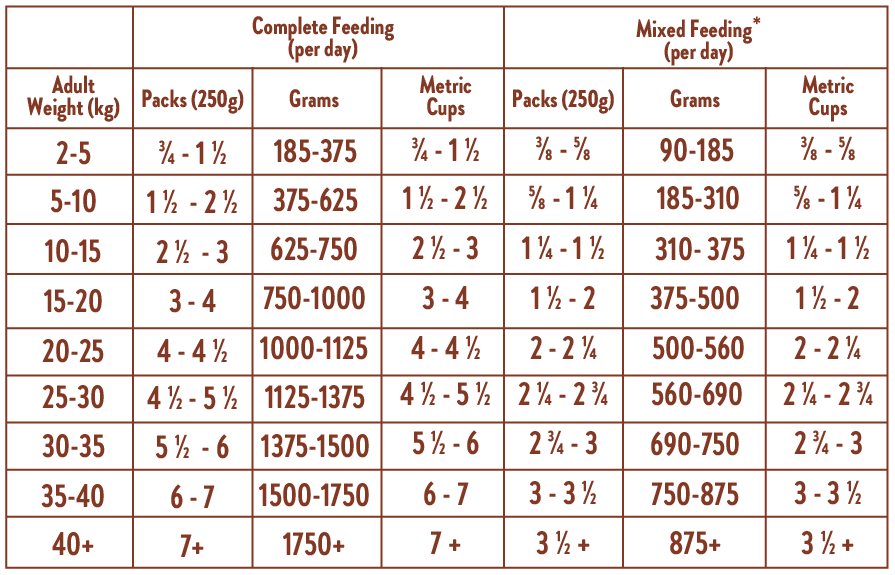The feeding amounts specified above are a guide only. The amount of food your dog requires will vary according to age, size, activity level and condition.